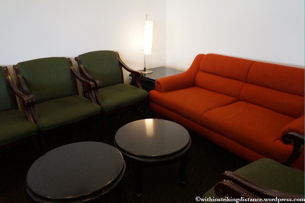A mix of armchairs and double couches in green, cream, or orange upholstery. Tired-looking – as was the rest of the lounge – with noticeable wear and tear around the edges. Didn’t try the flimsy-looking armchairs but they looked as if they’d be better off around a dining table than in a high-traffic lounge. Still, the couches were quite comfortable. Not a lot of space or seating to speak of, though this wasn’t a problem at first as there were only a dozen or so guests at the time. (It became a problem later, with the room gradually filling up as departure time drew closer.)