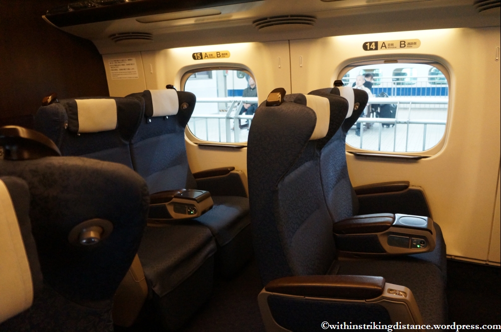 At Shin-Ōsaka, I transferred to the Sakura shinkansen service, which used a train similar to the one in the first picture below. The second picture shows the inside of the Green Car.