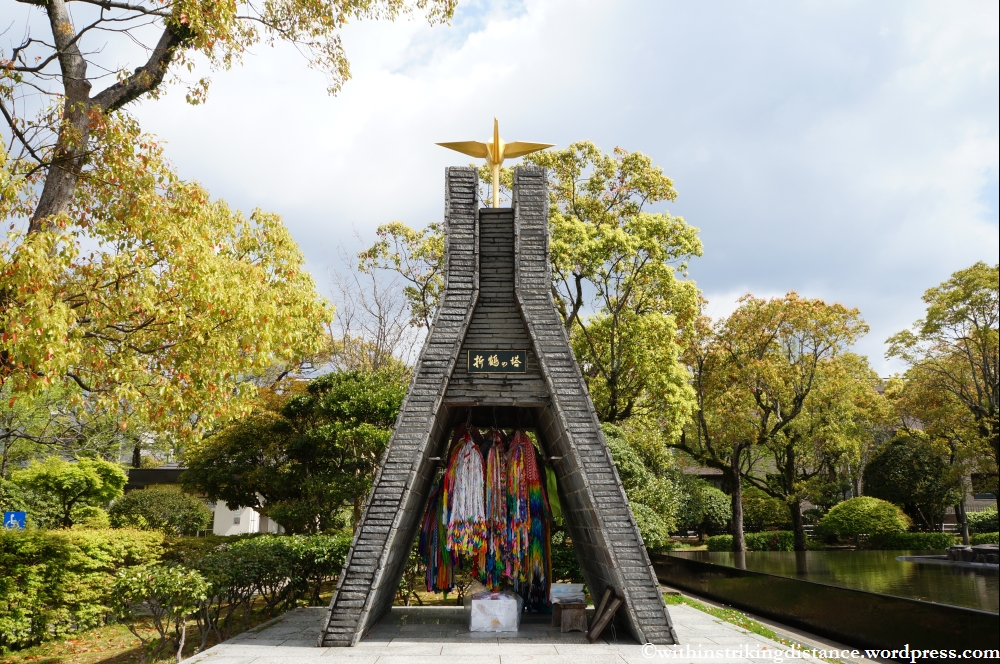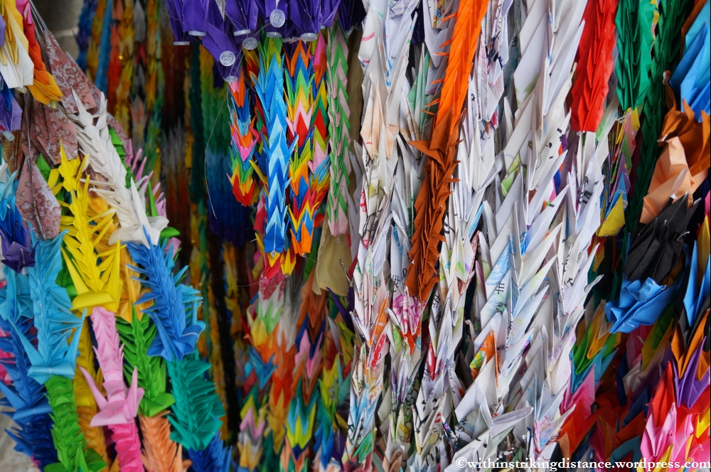 On either side of the statue stands a small stone-clad memorial chapel, each filled with long strings of paper cranes.