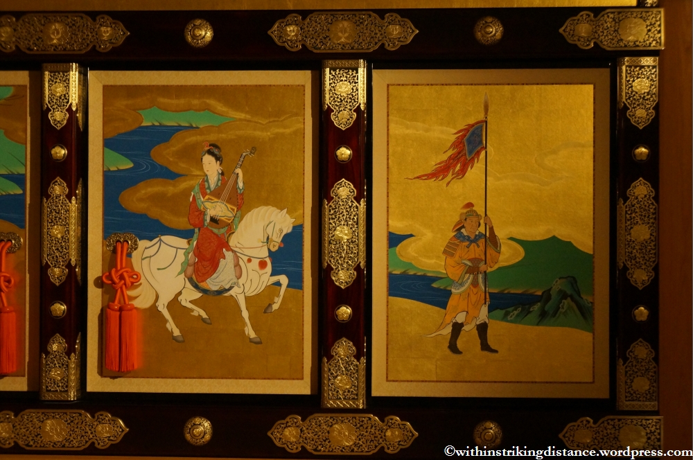 As I mentioned previously, this great hall consists of a series of interconnecting rooms, each with its own decorative theme. Except for the two most important rooms, the artwork has not yet been restored, but if you’ve been to Nijō Castle in Kyōto you’ll have seen a similar set of linked chambers (intact in that case) and can probably imagine what the rooms would look like when the blank spaces are filled up with beautiful illustrations. Starting from where we stood earlier and working our way towards the innermost chamber: