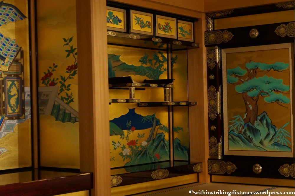 At last, coming to the end of the cavernous hall, we find ourselves looking into the Wakamatsu-no-ma, where the lord of the castle would have presided over audiences with his vassals. Judging from the name, the decoration would revolve around young pine trees, although I’m no botanic expert so I can’t positively identify the greenery painted upon the walls.