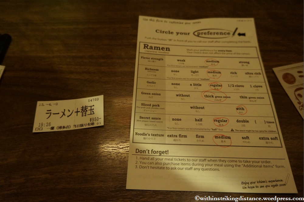 When I was doing my pre-trip research, I came across several blogs that spoke very highly of a Fukuoka-based ramen restaurant chain called Ichiran, famed for its version of the local speciality Hakata-style ramen. Whilst connoisseurs might view “chain”-anything with suspicion – and sometimes with good reason – I had no such qualms and was keen on trying the place out. As luck would have it, there was a branch somewhere in the sprawling Hakata Station complex not far my my hotel.