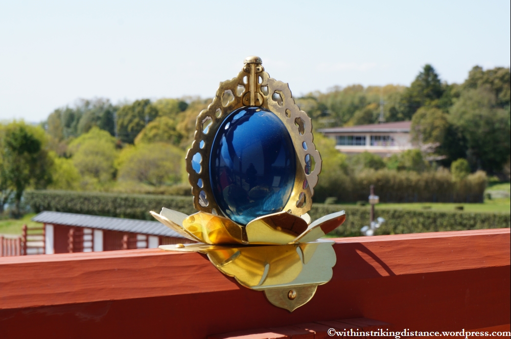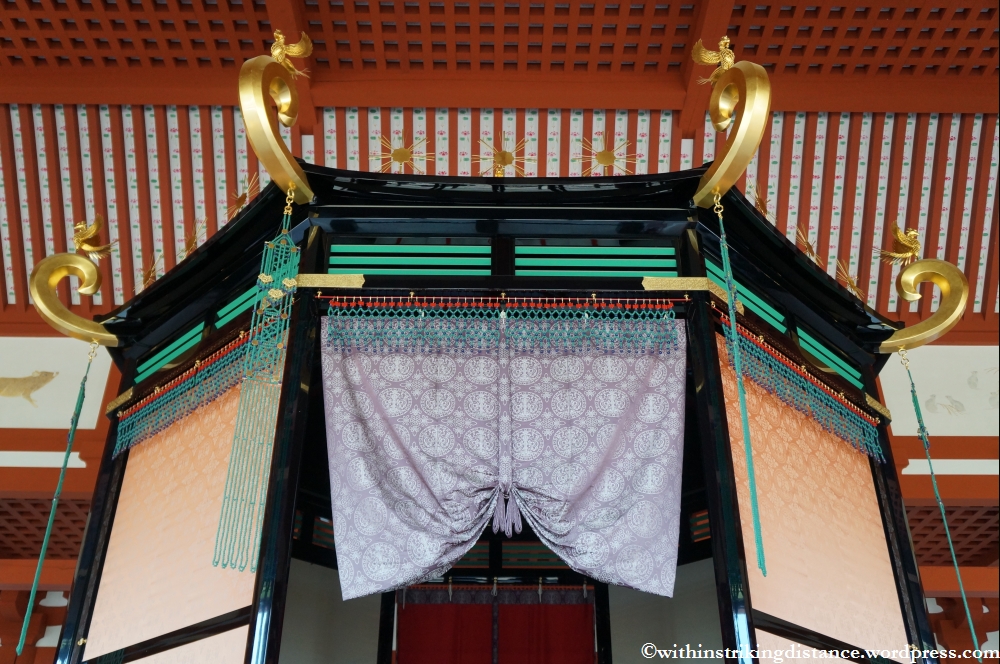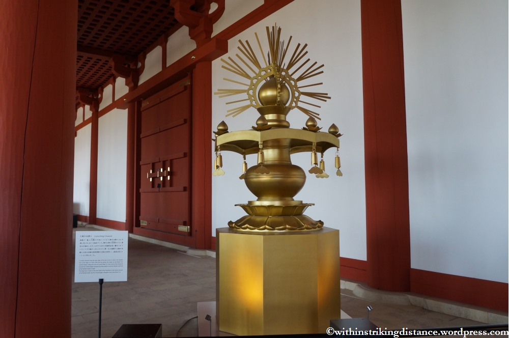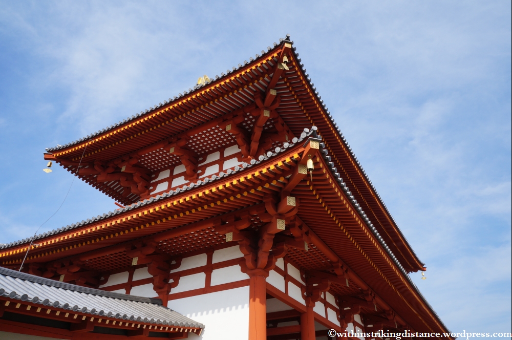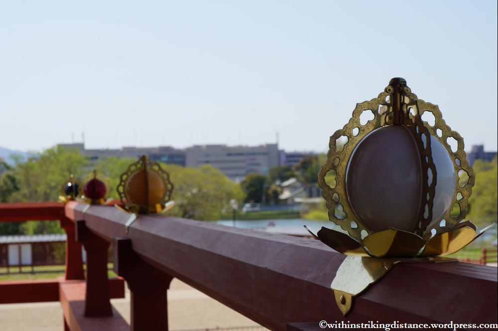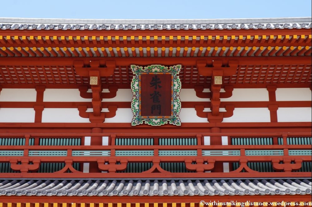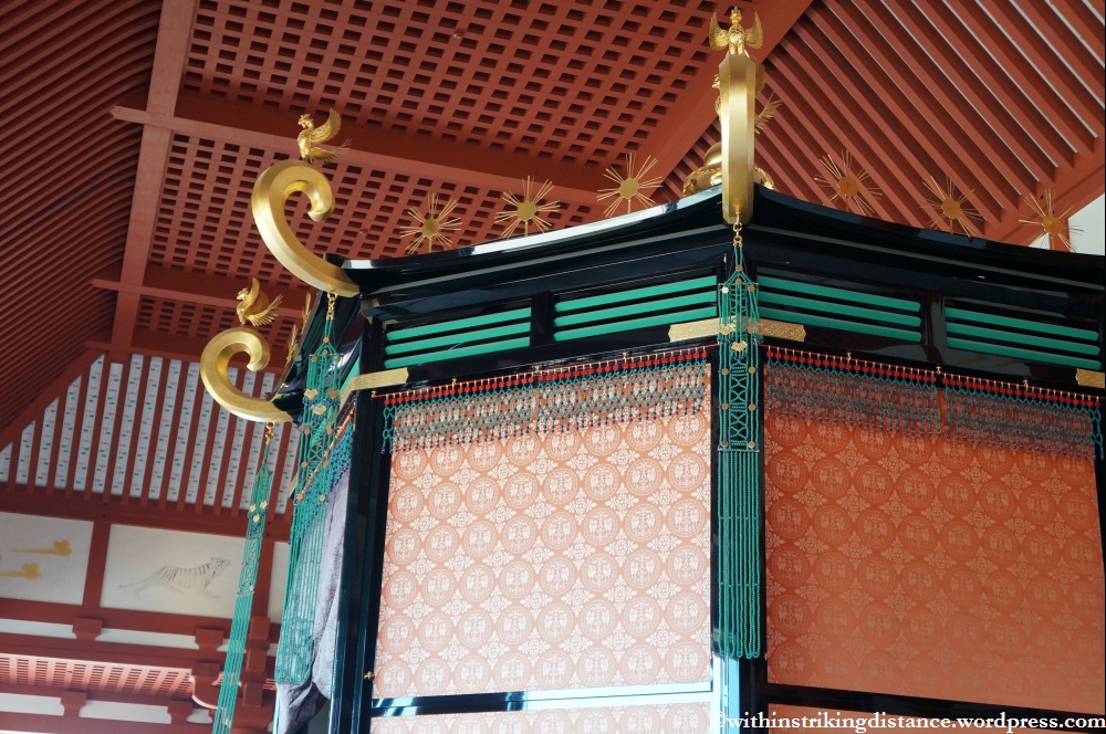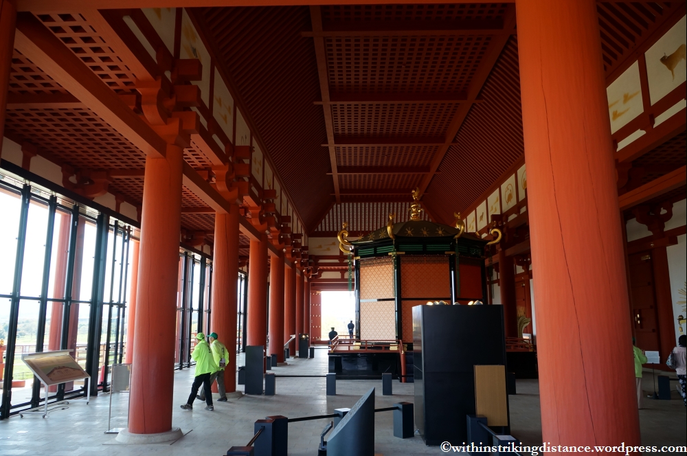 The hall is glassed in for protection from the elements, but you can step out onto the surrounding balcony for views of the grounds. That’s the Suzaku-mon in the distance.