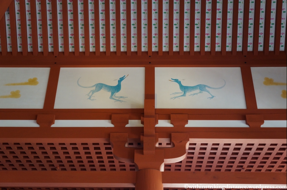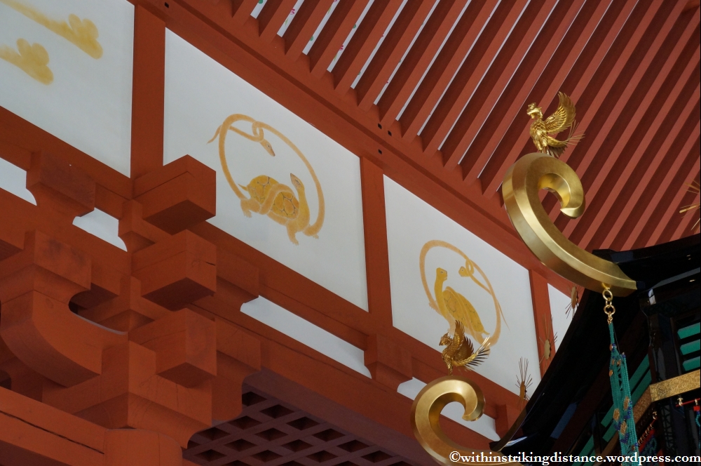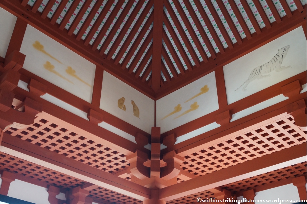 The spaces between the roof and the columns were decorated with images of four mythical guardian animals, each assigned to watch over a particular direction. The paintings were executed by artist Uemura Atsushi, a resident of Nara Prefecture.