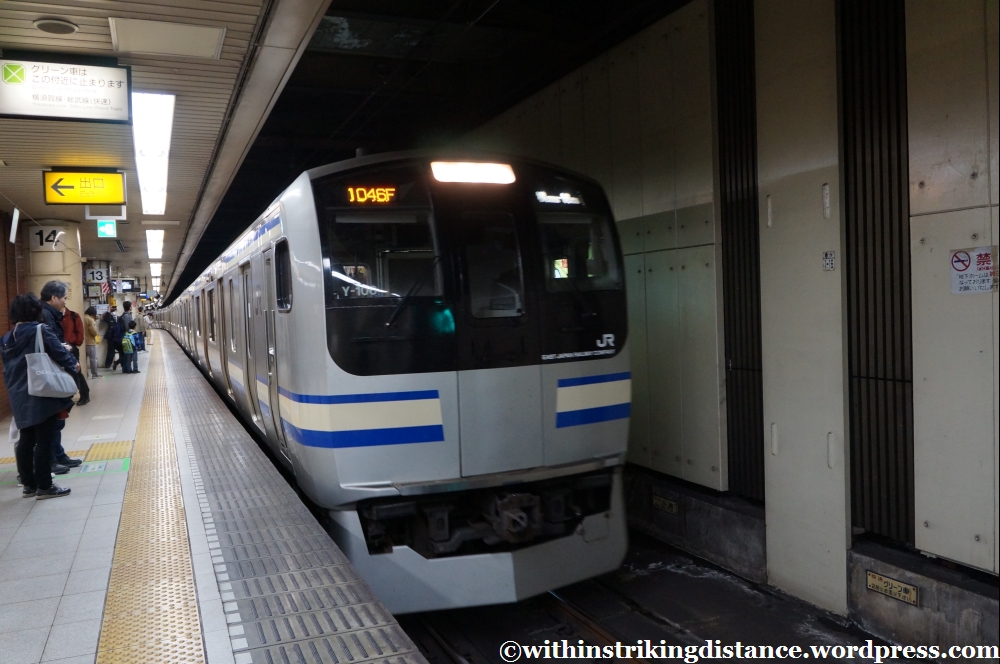 And here’s my train: an E217 series EMU, the reliable workhorse of several suburban JR lines running through the Tōkyō metropolitan area. I’ve grown quite familiar with – and rather fond of – this particular rolling stock as it’s used on the Sōbu Line rapid service that stops at the station nearest my usual Tōkyō hotel.