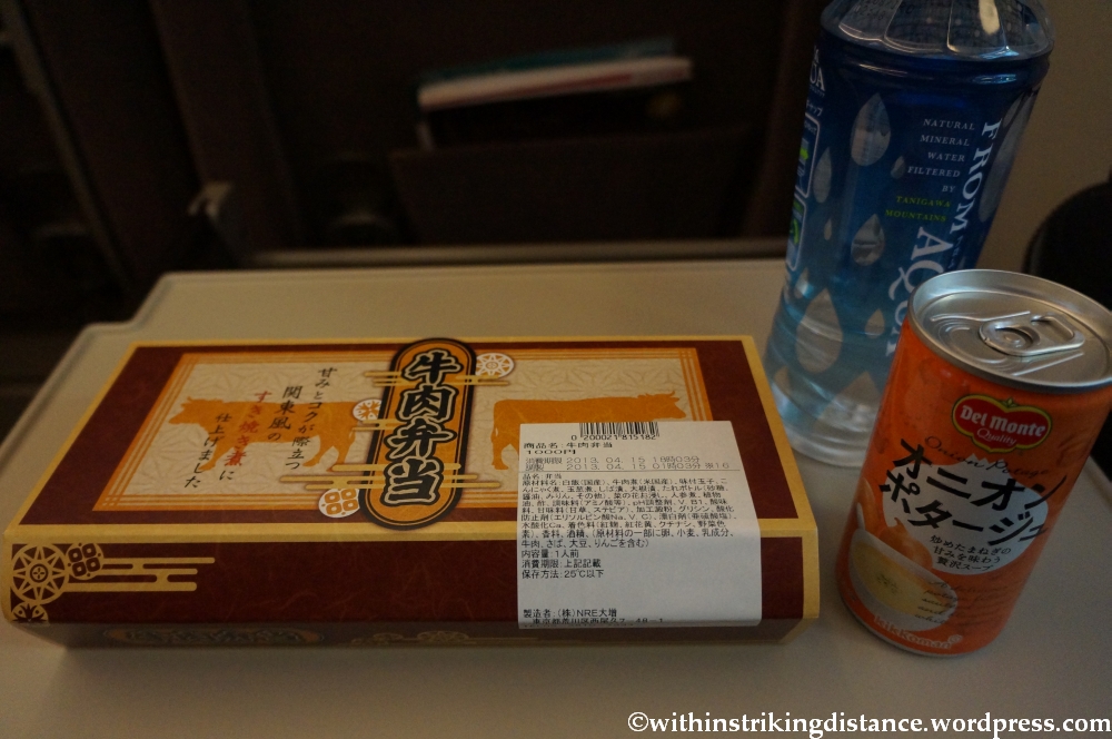 My choice for this trip was a simple bentō of beef served on a bed of rice, with a bottle of water and tinned heated onion soup (easily obtained from a hot drink-dispensing vending machine) on the side.