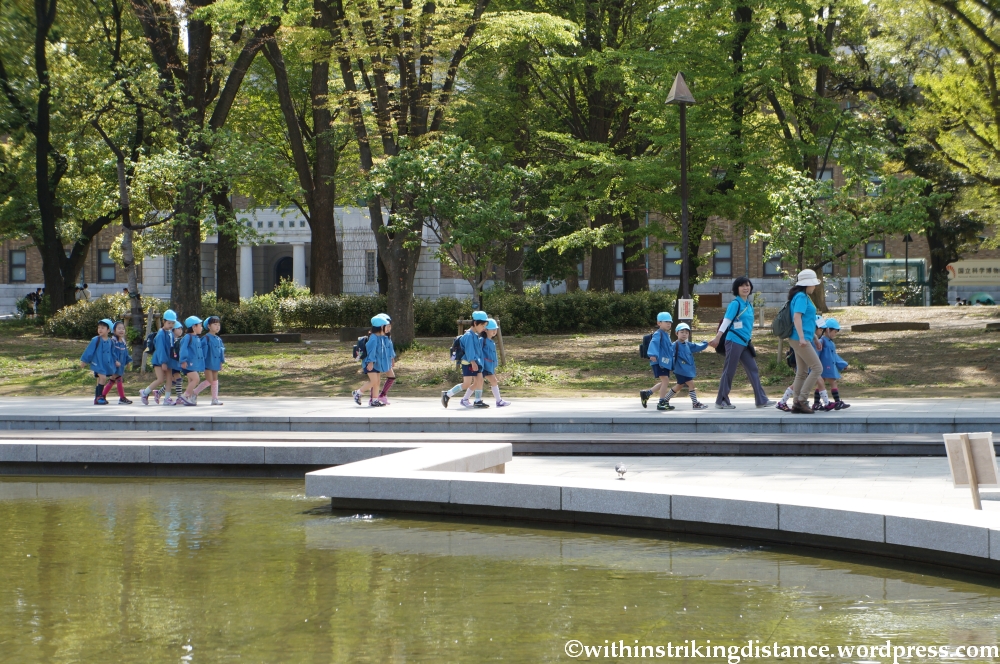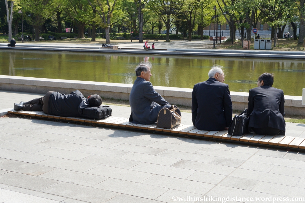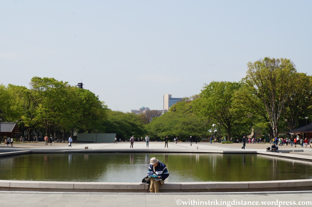 As I was standing right about where I took the preceding picture, I noticed small groups of uniformed high school students walking around with large envelopes in hand. From the snatches of conversation that I heard, it appears they were students from one of the prefectures affected by the 2011 Tōhoku earthquake, more specifically from the city of Ishinomaki (unless my hearing failed me then and my memory fails me now). One of them approached a man sitting not far from me and engaged him in conversation, encouraging him (as probably did his classmates with other park visitors around the reflecting pool) to visit their city and proffering a flyer from the envelope he carried; the man delightedly exclaimed that he’d been there before. It was a rather touching encounter, and a reminder that even now – more than 2 years after the event – people in the region are still making their way along the road to recovery.
