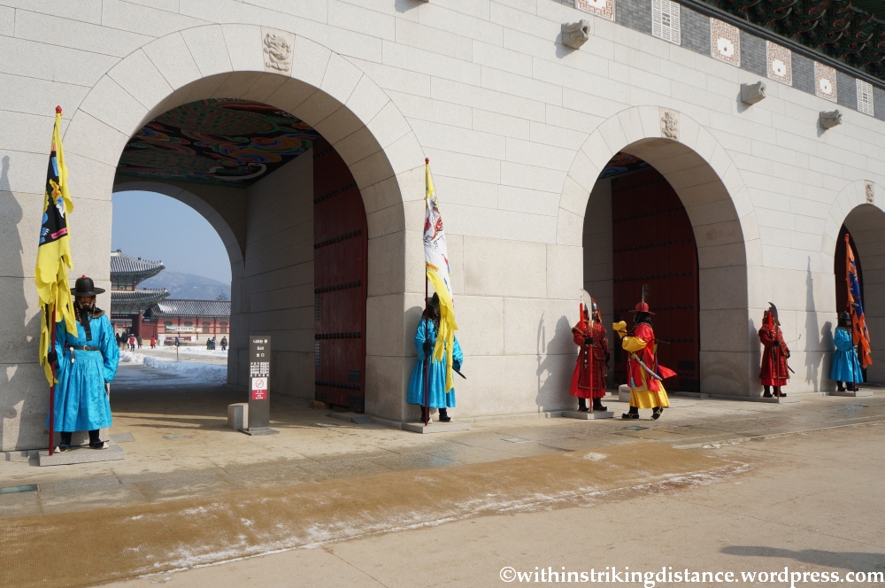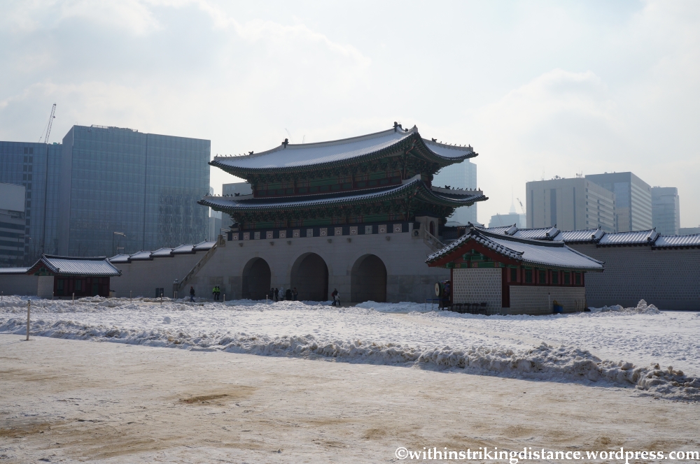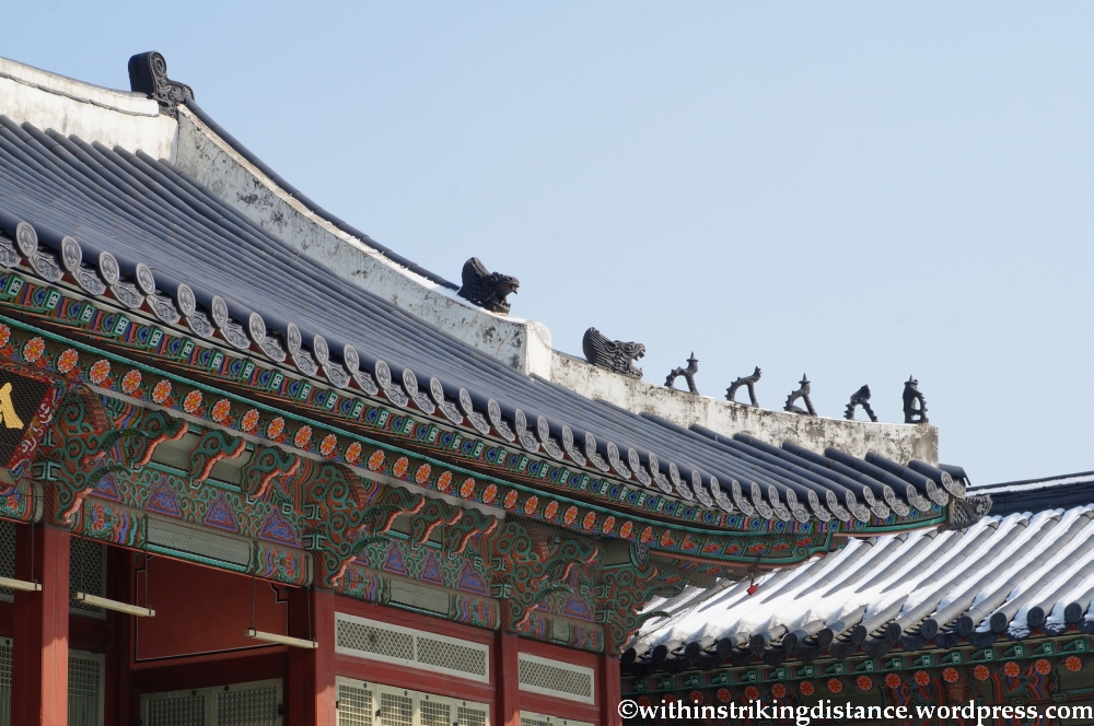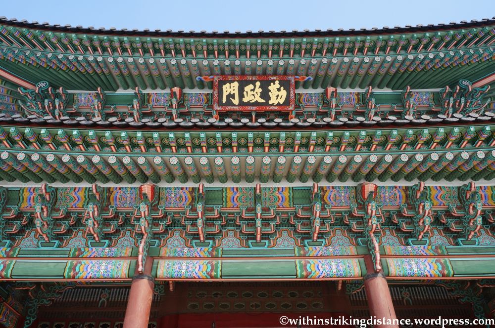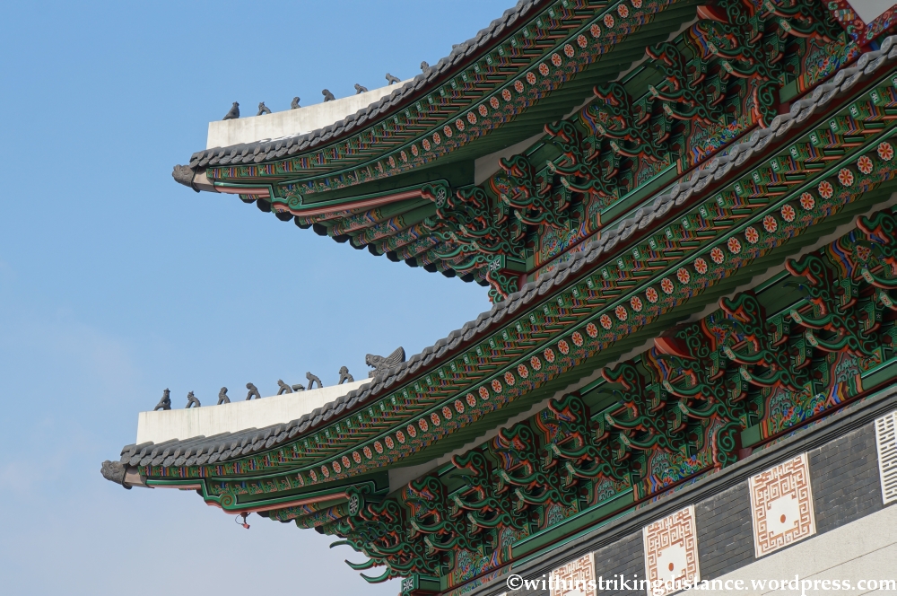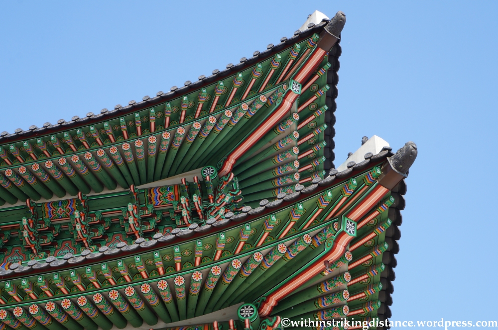 This is just one of the many gates in Gyeongbokgung, the largest of Seoul’s so-called Five Grand Palaces. Originally constructed in the late 14th century, the palace complex was destroyed and rebuilt more than once during its long history, the most recent round of demolition taking place in the 20th century when Japan was the occupying power on the Korean peninsula. Reconstruction work has gathered apace in recent years, with the number of buildings rebuilt (or surviving as originals) now approaching half of everything that once stood in Gyeongbokgung’s vast precincts.