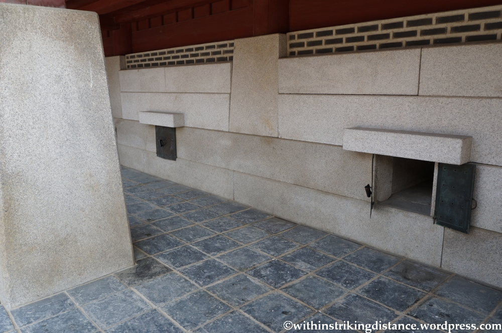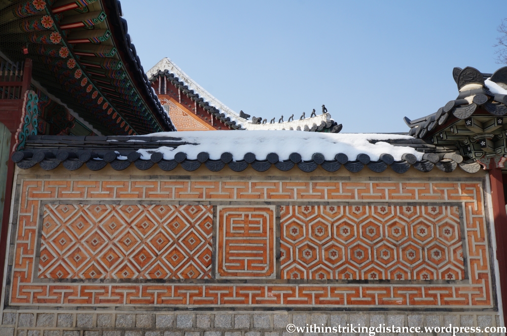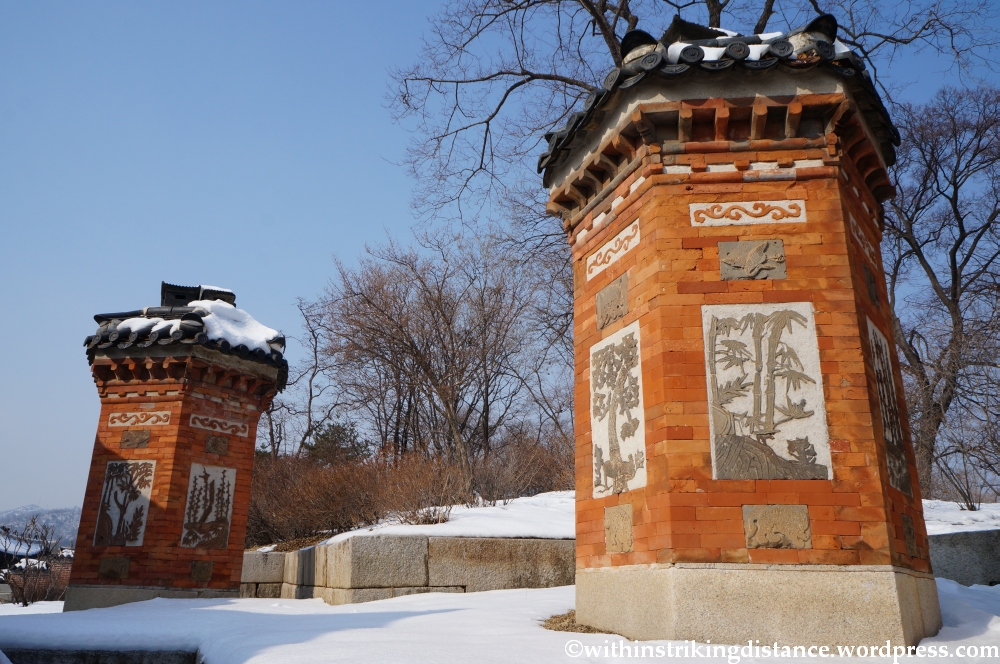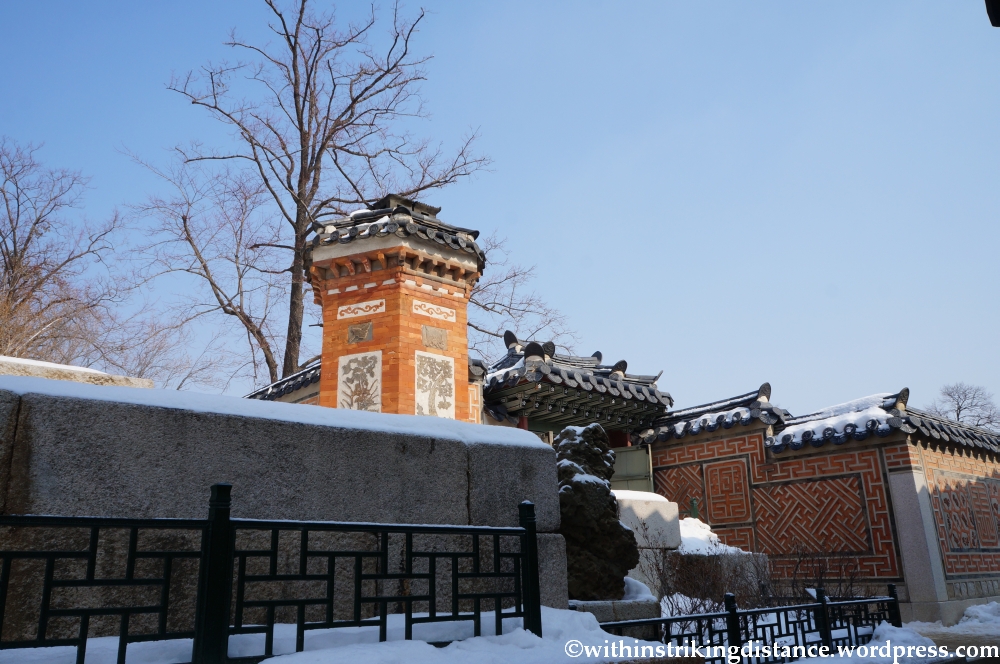 Behind Gyotaejeon is a lovely little terraced garden known as Amisan, which has a unique architectural feature: four hexagonal brick chimneys with decorated panels. The chimneys are likely part of the ondol system that provided underfloor heating to the queen’s quarters.