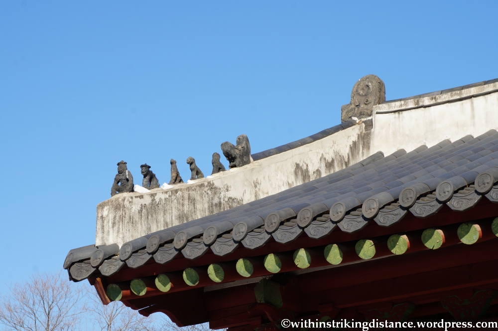 Like the Secret Garden in Changdeokgung, on most days Jongmyo can only be accessed on guided tours – unsupervised walks are not permitted. (The official pamphlet did state that visitors can see the shrine without a guide on Saturdays.) Having arrived a few minutes too early for the first English-language tour – scheduled to begin at 10:00 AM – I bought my ticket and killed time by admiring the shrine’s main gate . . .
