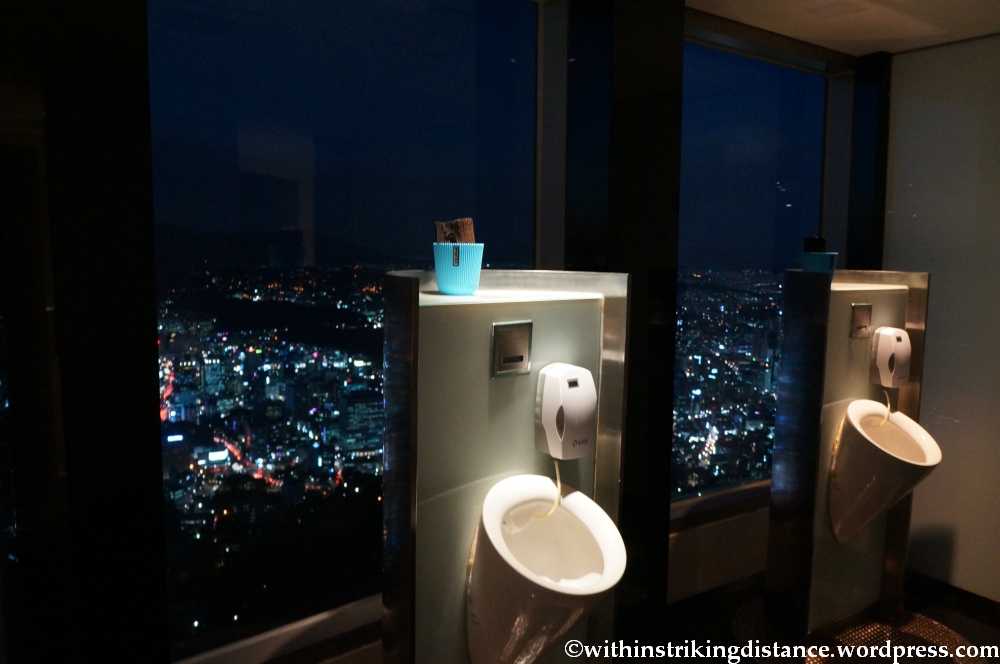On our way down, I stopped by the gents’ lavatories – where I found that patrons can still enjoy a splendid nighttime view of the city even whilst doing their sordid business at the urinals.