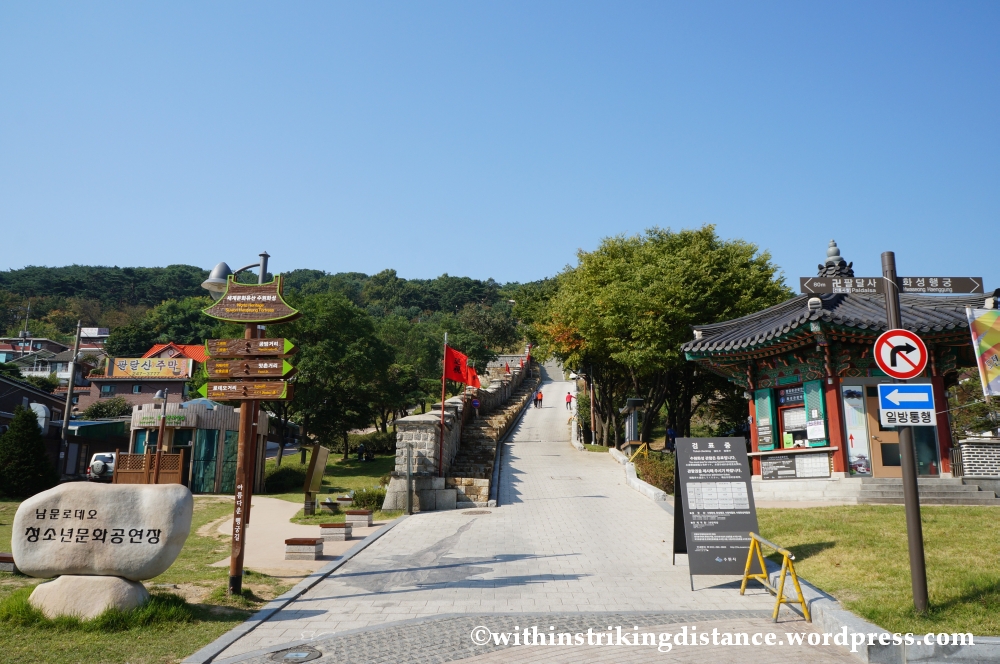 Except for certain sections that have not yet been restored, and probably never will be (including the area around Paldalmun itself), the wall runs on an almost uninterrupted course around the old centre of Suwon, making it possible for visitors to do a full circuit along or near the route traced by the fortifications. I didn’t have the time or the energy to attempt a complete circumambulation, but I was determined to cover at least the long stretch leading uphill from the southern gate.