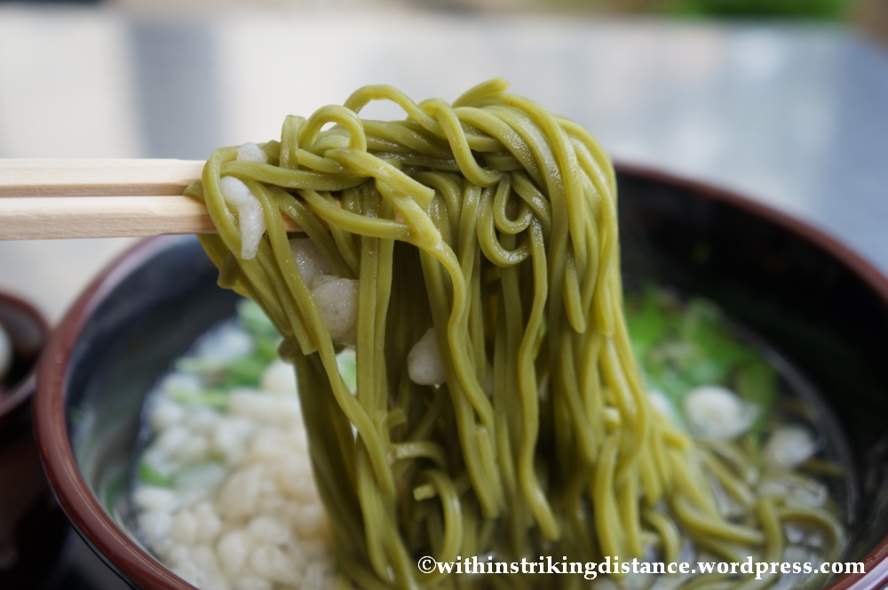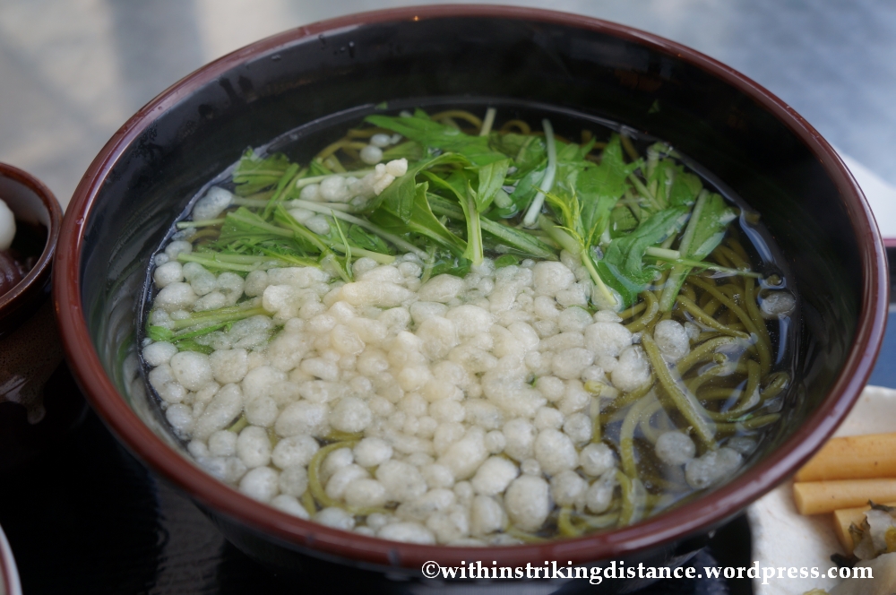 The set meal included a small dessert, a side dish of tsukemono (pickled vegetables), and a bowl of rice sprinkled with finely chopped tea leaves. The star of the show, of course, was the main dish: a bowl of green tea soba served in a piping-hot broth and topped with tenkasu. Although not labelled as such on the menu, this pretty much fits the description of a haikara soba.