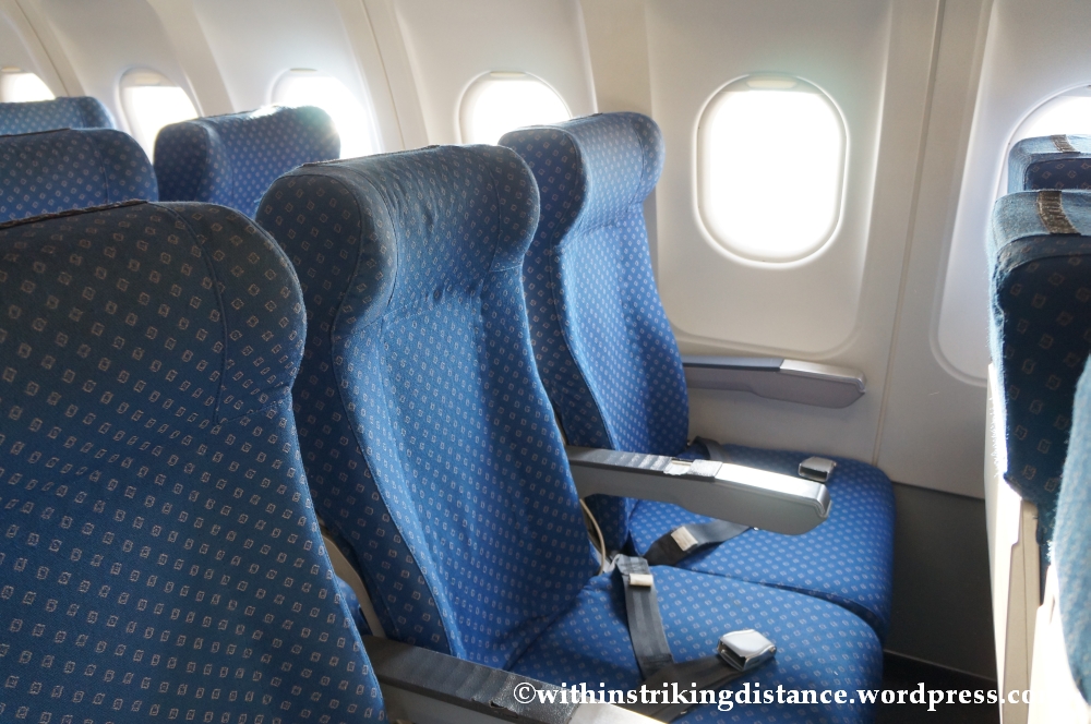When I checked in online, the system originally assigned me a seat towards the rear of the plane, but this was changed on my request to exit row seat 14A at the airport counter. (Without charge, I might add. Perhaps not enough passengers were willing to fork over an extra PHP 400.00 to pre-book this plum position online.) I’m not a large fellow and didn’t particularly require the extra legroom, but it proved useful in the end as I found it so much easier to put on my long thermal socks and retie my shoelaces.