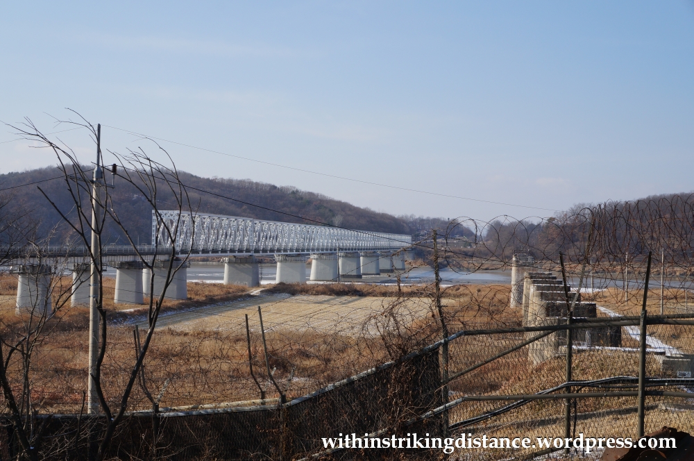 …is a wooden footbridge that leads to a closed gate. Beyond that gate is a railway line that continues northwards across the river, via the so-called Freedom Bridge – named for its role in facilitating the transport of thousands upon thousands of prisoners back to home territory after the end of the Korean War. There are actually two bridges that cross the Imjin River at this point, one of which was left an unrestored ruin after war’s end; you can still see the concrete supports of that other span in one of the photographs below.