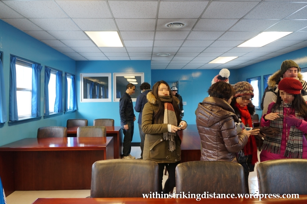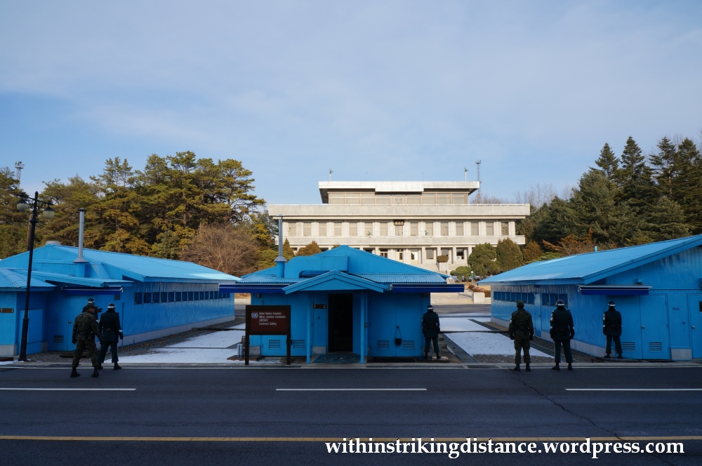 After passports were inspected and lists checked off, we boarded two military buses which had special permission to travel within the DMZ. Each bus was accompanied by an American soldier who would act as both guide and minder. The journey to the JSA took us through eerily peaceful landscapes – no doubt very heavily mined – featuring forested hillsides and barren fields sleeping under a coverlet of snow … none of which I could take pictures of due to the ban that was in place. Under the watchful gaze of the young army officer, I made sure to quash even the slightest inclination to sneak a snapshot, and the beautiful scenery composed of shades of brown splashed with white, set against a brilliant blue backdrop, must sadly remain preserved only in my memory.