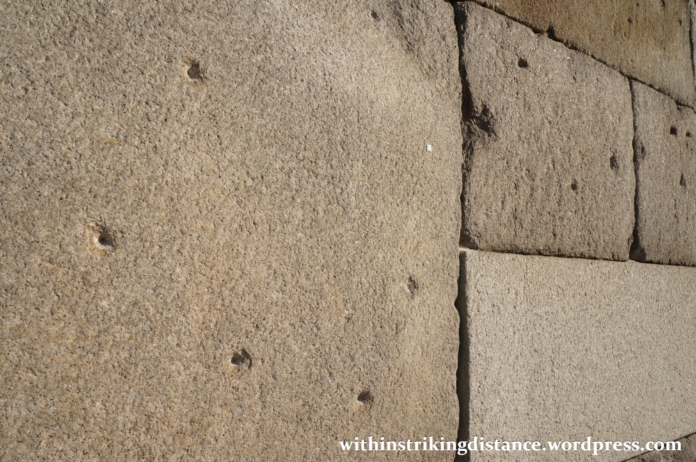Now let’s move in for a closer look at the gate. The original, age-darkened stonework is easily discernible against the lighter backdrop of the new masonry brought in to recreate the missing sections of wall on either side. Note also how the scars of past conflicts – bullet holes in this case – have been left untouched in some of the older blocks, a visible reminder of the wars that have ravaged Seoul through the centuries.