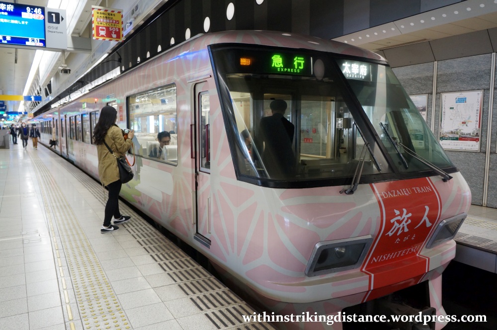 The easiest way to reach Dazaifu from downtown Fukuoka is by way of Nishitetsu’s Tenjin Ōmuta Line, with a short final stretch on the Dazaifu Line (run by the same operator); the journey takes about half an hour with a change of trains at Nishitetsu Futsukaichi Station. I could have taken any one of the frequent services that ply that route, but when I learned of the special “Tabito” service my interest was instantly piqued. The fact that a trip involving the “Tabito” costs the same as a ride on any other Nishitetsu train serving this route (JPY 400), and – perhaps more importantly – the fact that the first “Tabito” run of each day takes you straight to Dazaifu without the usual transfer at Futsukaichi, pretty much sealed the deal.