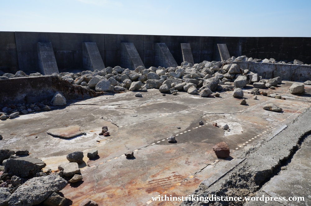 Here’s a zoomed-in bird’s eye view of Gunkanjima’s southern tip, where the tours currently take place. The authorised route and the three viewing areas are readily discernible as bright stretches of newly-laid concrete on top of older rubble.