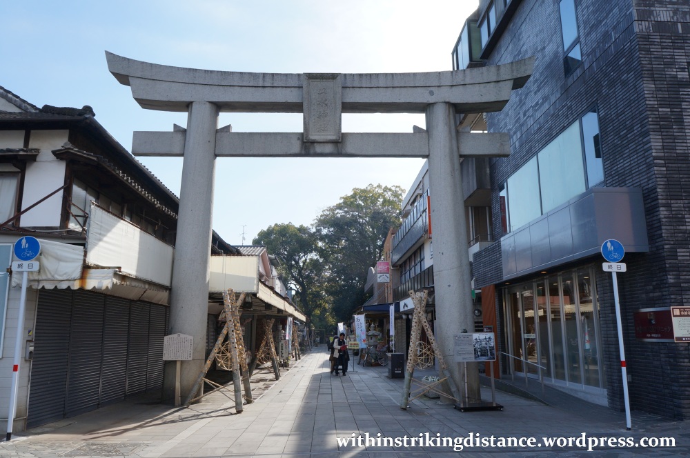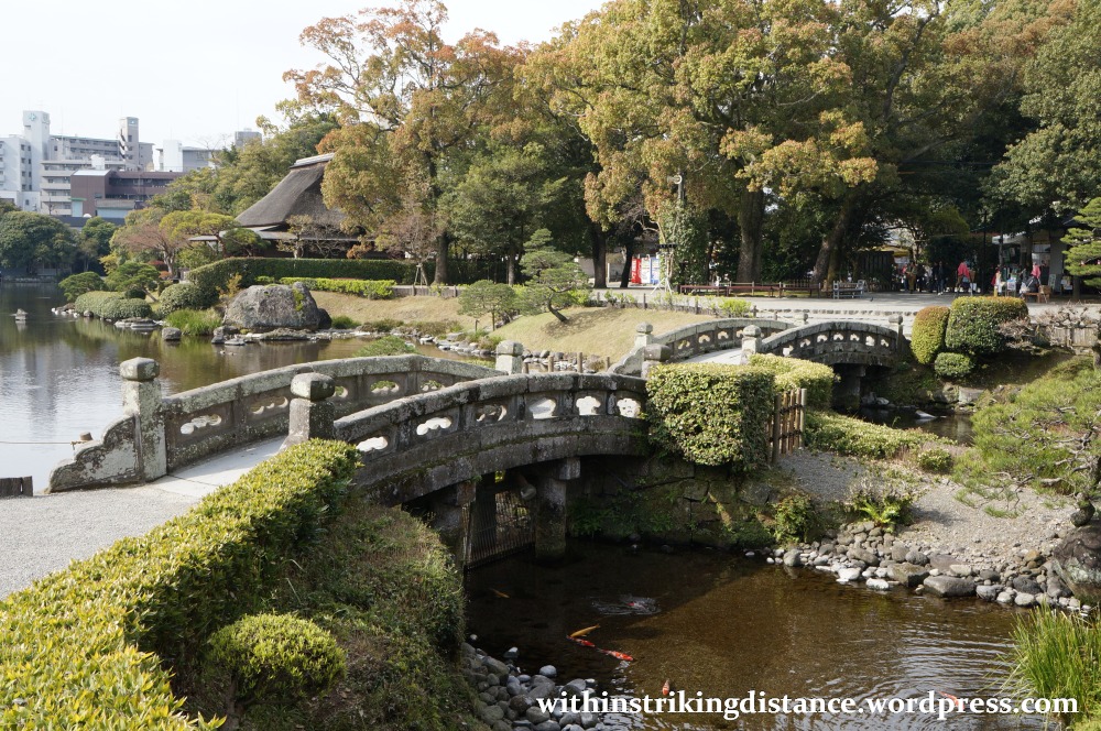 After arriving at Kumamoto Station two minutes past eight, I deposited my bags in a locker and hopped onto a city tram bound for the Suizenji-kōen stop. (Japan Guide has some good advice on how to get here.) My destination for the day was just a short walk away, down a street lined with shops and straddled by, of all things…