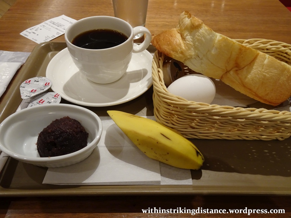 After a quick stroll through the city’s main railway station, I chanced upon Trazione Nagoya, an Italian-themed restaurant that serves a range of pasta dishes but also whips up some reasonably priced breakfast sets in the morning. I settled on the 小倉トーストモーニング (Ogura tōsuto mōningu, 380 yen), a simple set meal that includes a thick slab of lightly toasted bread, a hard-boiled egg, a small piece of banana, and your choice of coffee or tea (served either hot or iced).