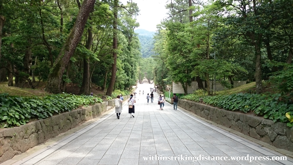 …which straddled a tree-lined, stone-paved pathway. The long road sloped gently downwards as it led me away from the bland modernity of the town that had grown up around the shrine, taking me closer to the thickly wooded hillside that forms the backdrop to this ancient compound. It was a long but quite pleasant stroll, with the vibrant green shades of the surrounding forest and the colourful bunches of ajisai in full bloom – not to mention the heat and humidity – reminding me that we were deep in the embrace of summer.