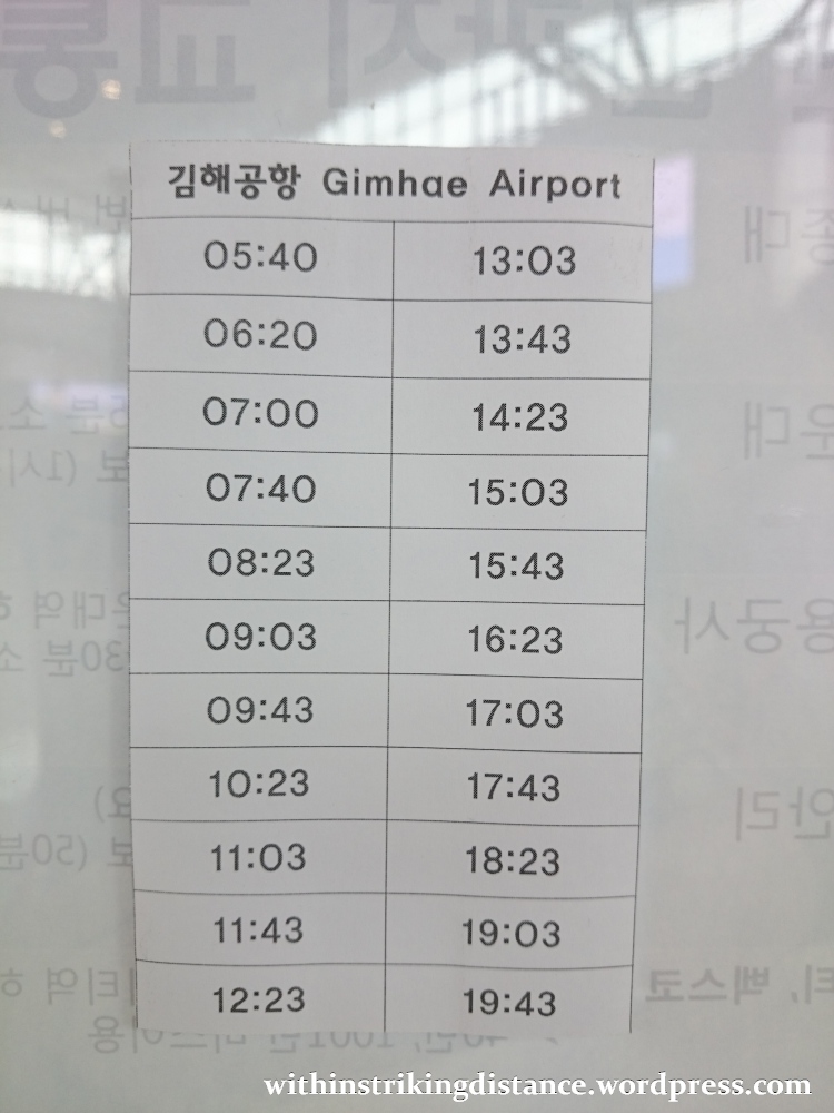 Both the tourist information desk at Busan Station (where I snapped the two pictures above) and the reception staff at my hotel estimated the required travel time to PUS as “about 1 hour”. A little too vague for comfort, perhaps, but understandable given that traffic conditions are difficult to predict. In any event, the limousine bus swung by just before the scheduled 1543 departure time, left precisely on the minute, and – with light to moderate traffic volume along the way – arrived at the airport’s international terminal about 40 minutes later.