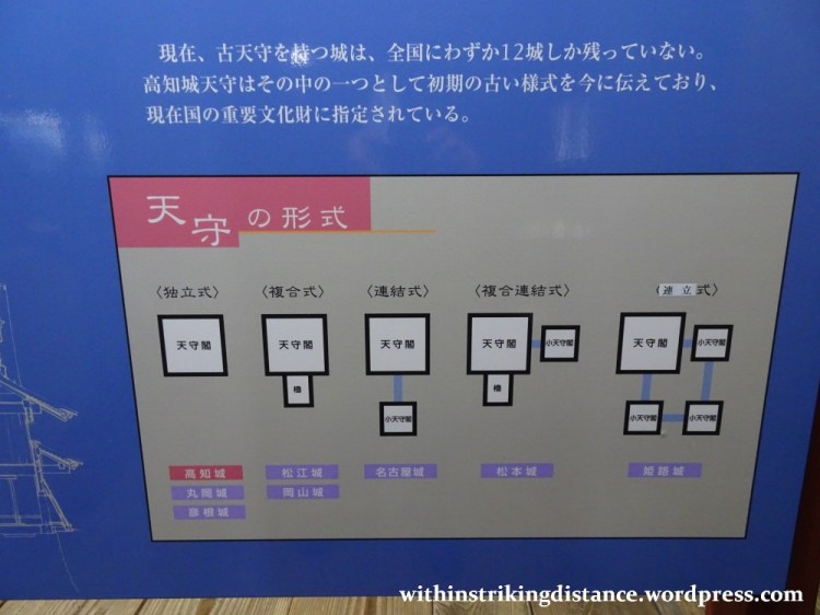 There was also a nice little information board summarising the various forms of tenshu that one might encounter in Japanese castles. Kōchi is of the first type, with a dokuritsu-shiki donjon that stands independently with no secondary tower linked directly to it; similar examples listed underneath it are Maruoka and Hikone.