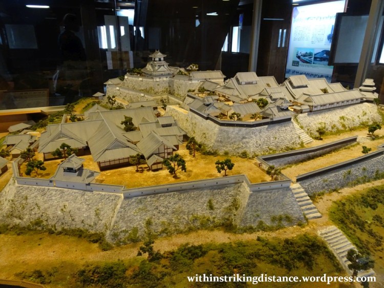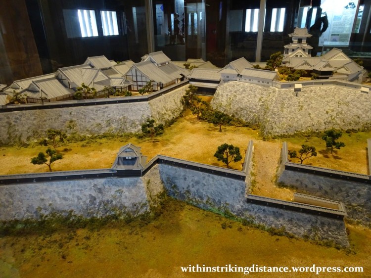 …but it’s actually a quite cleverly designed structure for the castle’s defence. Known as the Tsumemon, the gate was built across a gap between the innermost honmaru enclosure and the secondary ninomaru enceinte close by. Here’s a shot from the scale model we saw earlier, showing the Tsumemon (from the other side of the one shown in the picture above); in the model the honmaru (with the tenshu) is on the right whilst the ninomaru is on the left.