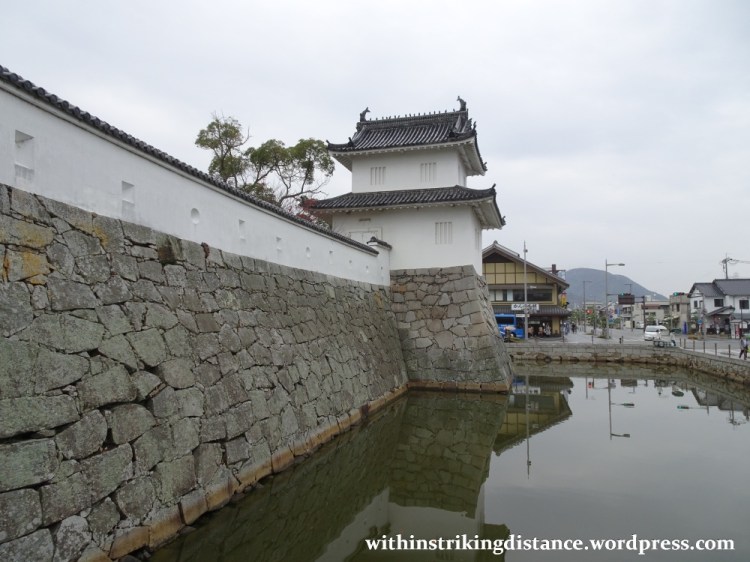 The castle is a fairly easy walk from Banshū-Akō Station – say, 15 minutes or thereabouts depending on one’s preferred pace (and preferred frequency of shopping or snack stops on the main road). Having run that gauntlet, the first major feature one will encounter is a small section of water-filled moat, on the other side of which stands the Ōtesumiyagura watchtower.