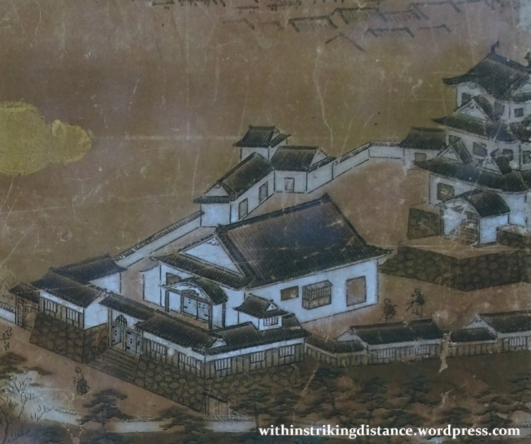 Here’s part of an old painting showing Uwajima’s honmaru enclosure as it looked during the Edo Period, with its buildings still intact (and the tenshu standing on the right). It’s quite interesting to see how the present-day ruins – the gateway on the left, for example, and the hall in the middle – closely correspond to the various structures in the depiction.