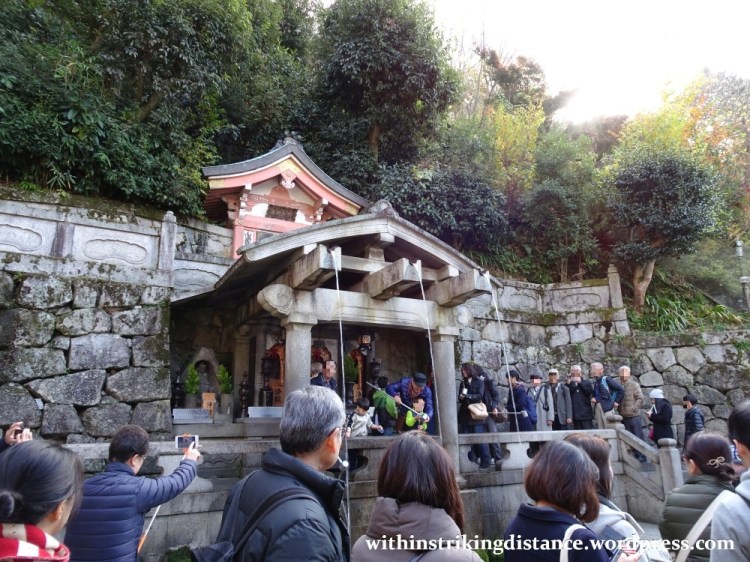 From here, I descended into the valley and headed north towards the foot of the Hondō, close to which stands the Otowa-no-taki (音羽の滝). Streams of clear, pure water – giving rise to the name of the temple itself, kiyomizu (清水) – are channelled through three separate stone spouts into a pool below. Visitors reach out with long-handled dippers to catch the water as it cascades from the spouts, believing that to drink from this source will aid them in various ways: purification, longevity, or other aspirations of that kind. Needless to say, the queue was long…