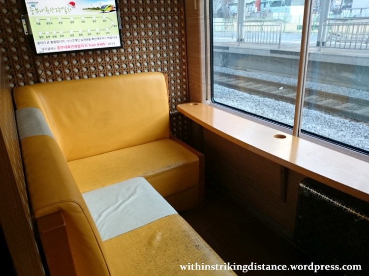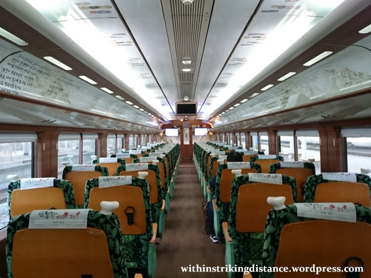 This service is just one link in a long eastbound loop that connects to another tourist line, the V-Train … but I won’t write about any of that here, since I didn’t go on the full experience. (If you can cope with or at least wade through Korean text, you can learn more on the relevant pages at the KORAIL website.) In my case, I only used the train as if it were a commuter service, so I’ll focus on the seating and onboard facilities.