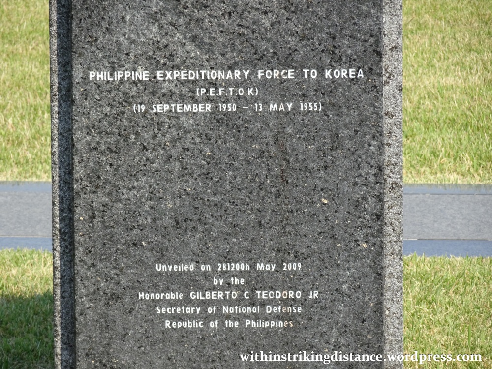 The Philippines sent 7,420 soldiers to fight under the United Nations Command. 116 were killed in action, all of whom were brought back home; hence the absence of Filipino graves amongst those in the UNMCK. Even so, our flag flies proudly above the symbolic plot reserved for the Philippine Expeditionary Force to Korea, and the sacrifices made by those who participated in the conflict are remembered in a handsome granite memorial dedicated in 2009 by then-Defence Secretary Gilberto Teodoro.