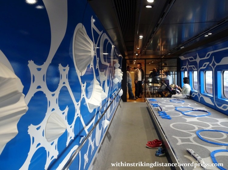 Car 13 is divided into two sections. The forward half was fitted out according to a design from “Paramodel”, an artistic collaboration between Hayashi Yasuhiko and Nakano Yūsuke. An elevated platform furnished with model train kits serves as a play area for younger travellers.