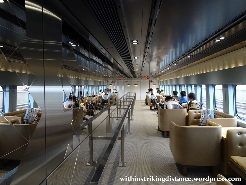 All seats from Car 12 to the end of the train are non-reserved, so anyone who’s paid the appropriate fare can take whichever unoccupied seat they like. And speaking of seats, note the forward-facing (or rear-facing, depending on the direction) armchairs wedded to two-person couches – certainly not the sort of thing one might expect to see on a typical shinkansen train.