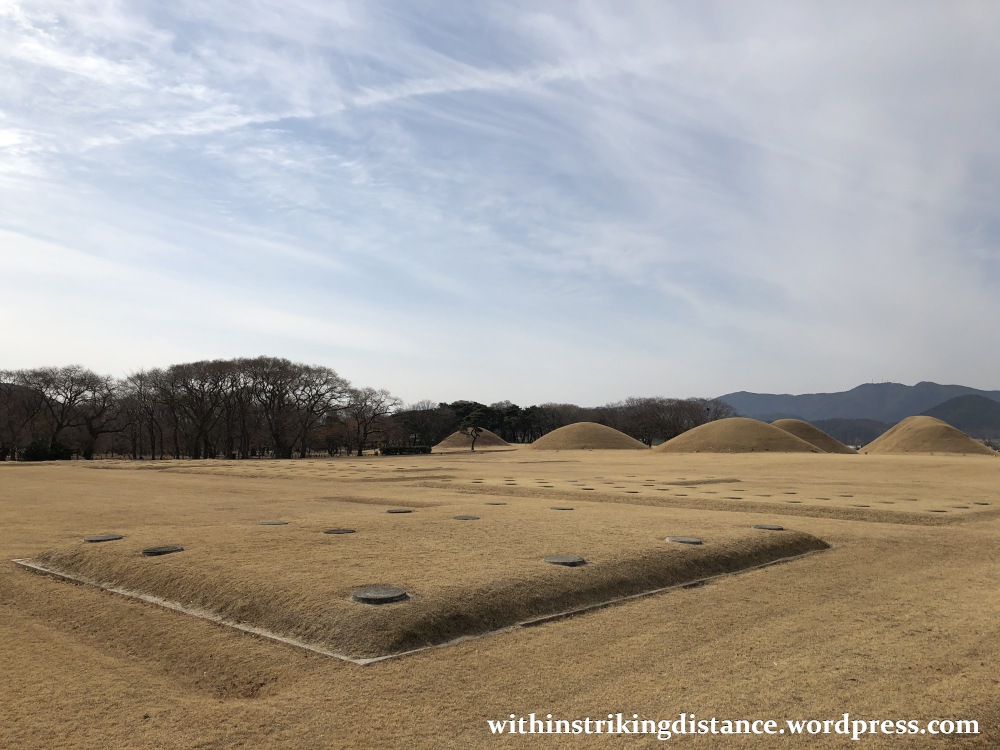 I began heading south, past the excavated foundations of large wooden structures. One could see in the distance some of the grass-covered mounds built over the tombs of the ruling class – amongst them, the tumulus of King Naemul, the 17th monarch of Silla (reigned AD 356–402).