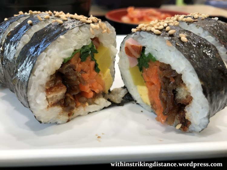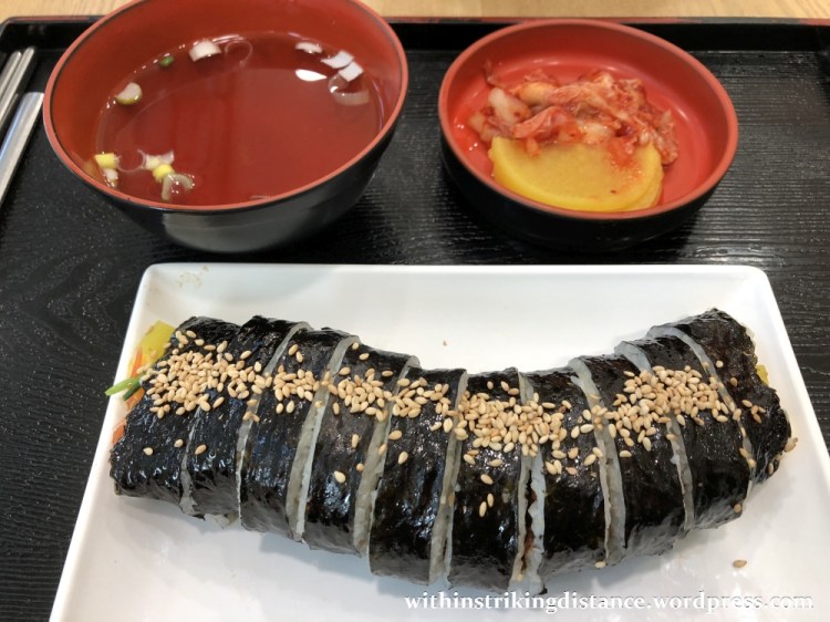 Fortunately, I found an empty space and quickly tucked into a light supper (well, light by my standards anyway) of gimbap and clear soup.