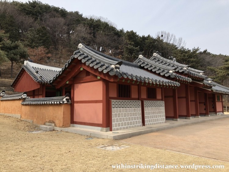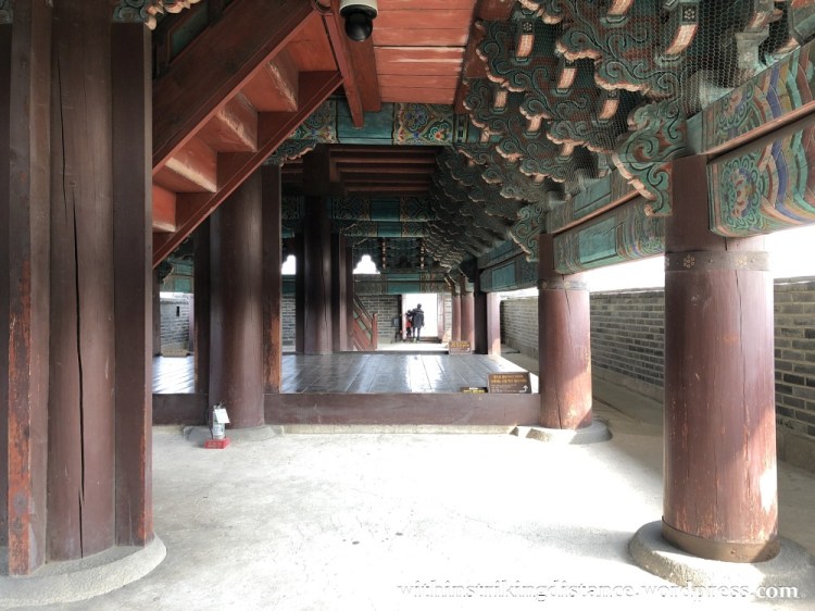After a moment’s rest in a nearby shop, I followed a path down the eastern slope of Paldalsan, heading for Hwaseong Haenggung. About halfway on the descent, I paused for a look at Seongsinsa (성신사), a shrine built in 1796 for the protection of the Hwaseong fortress. If it looks new for a more than two-century-old structure, that’s because it underwent a major restoration in 2008-2009.