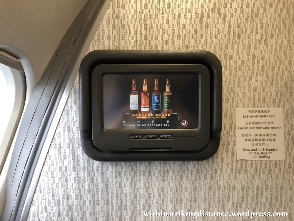 The cabin was fitted with CX’s current regional Business Class seats, introduced in 2013 to replace the ageing armchair recliners I experienced on the same route several years ago. Granted, these don’t feature the same level of privacy and comfort offered by the CX long-haul product, which is occasionally fielded on regional routes as well; see here and here for example. Nonetheless, lie-flat bed-seats aren’t a necessity on these short flights, and don’t make much economic sense for the local or regional market in view of the larger onboard floor space they’d consume (at the expense of additional fare-earning seats).