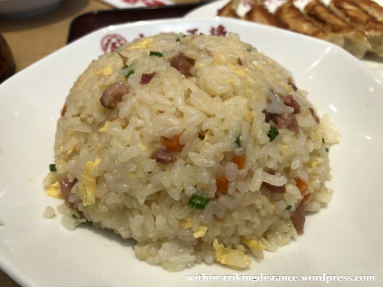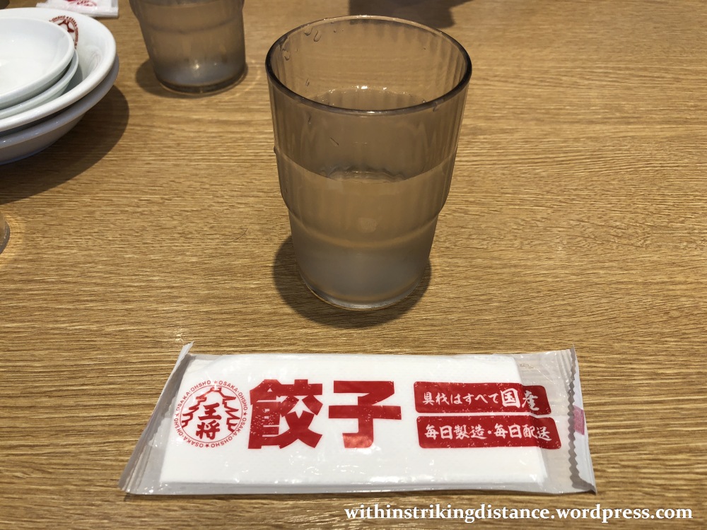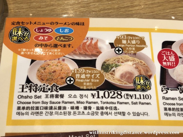 …before moving on to the menu. I’ve chosen the “Ohsho Set” (王将定食, Ōshō Teishoku, 1,110 yen with tax): a veritable feast-on-a-tray consisting of gyōza, rāmen, and chahan. An extra 100 yen gets you a larger serving of noodles, but I decided to upgrade my chahan instead for 150 yen.