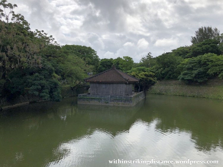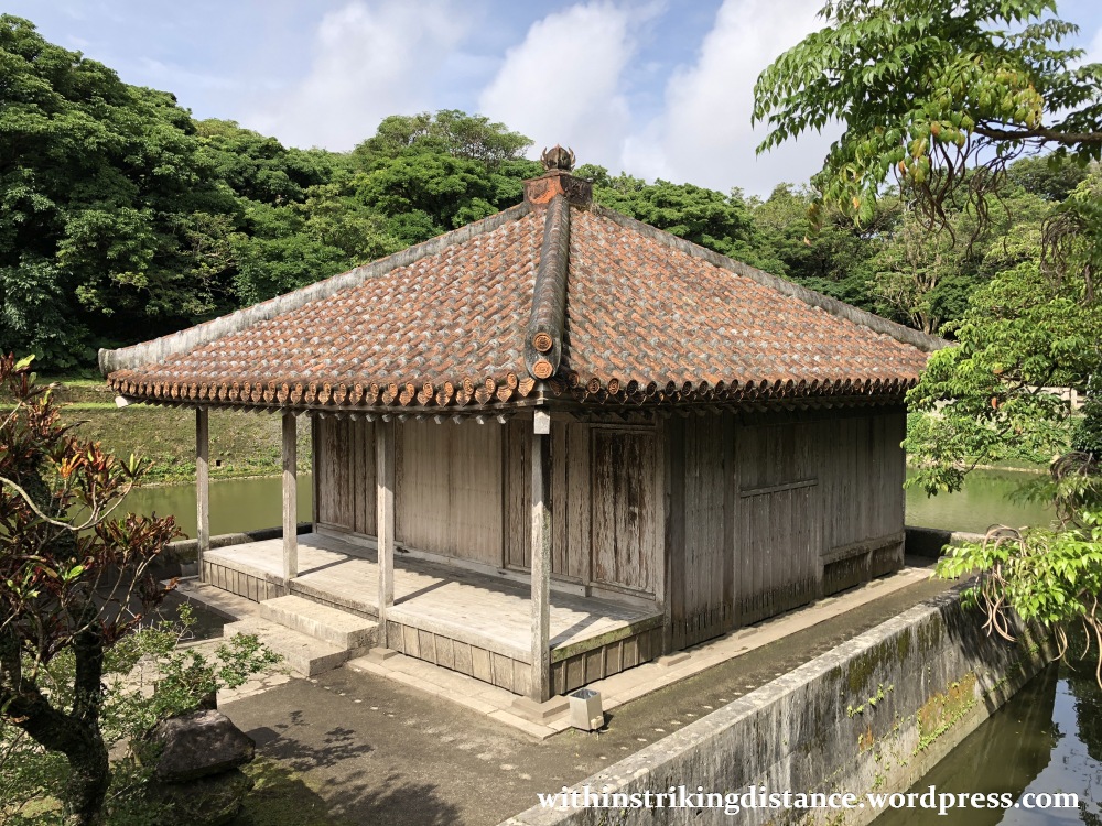 The wooden structure on the small island is the Bezaitendō (弁財天堂). Originally constructed in 1502 as a repository for Buddhist scriptures sent from the Kingdom of Joseon (modern-day Korea), the shrine was destroyed during the Satsuma invasion of 1609 and not rebuilt until more than a decade later. Obliterated yet again during the Battle of Okinawa in 1945, Bezaitendō was re-erected in 1968.