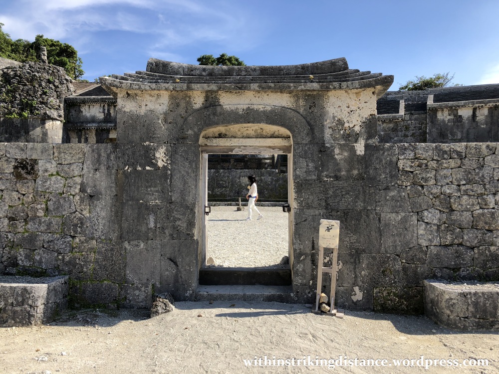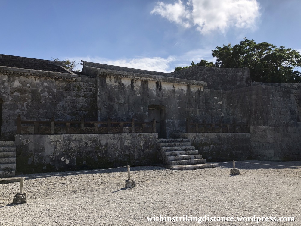 The first thing we’ll see is a wall of solid Okinawan limestone, with a single gate facing north. (Note the red-roofed wooden structure at the far end; we’ll have a closer look at that later.)