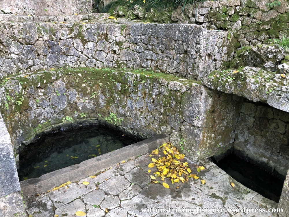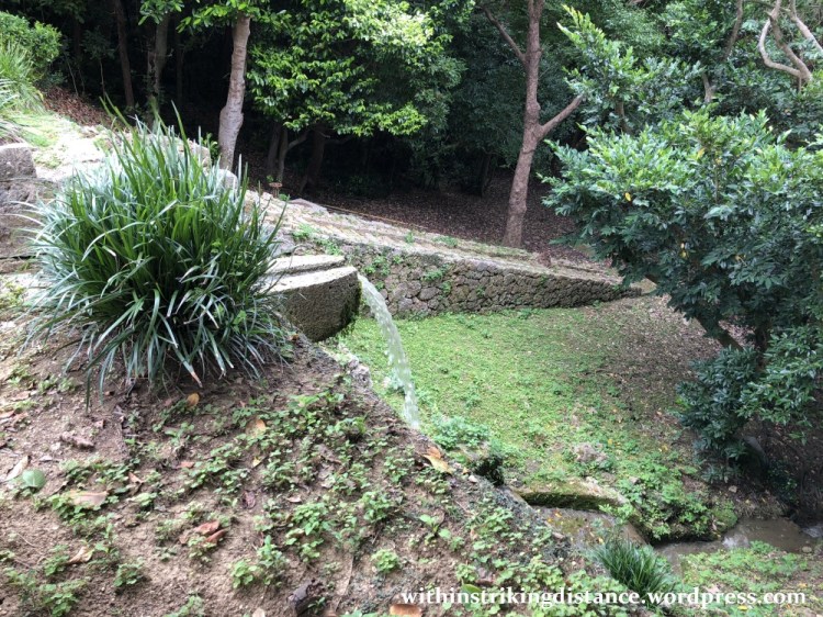 Looking towards the west, we spied a small bridge built over an opening along the edge of the pond. Excess water flows through this outlet – known as the Taki-guchi – and shoots out of a stone spout into a channel below, forming a small waterfall as it does so. I observed a long flight of stone steps leading down to the bottom of the ridge; alas, the way was blocked and I couldn’t get a proper glimpse at the waterfall itself.