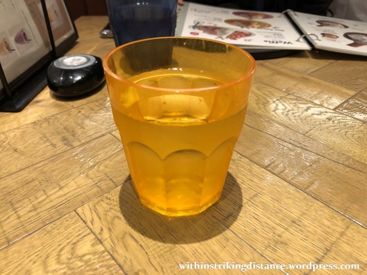 A glass of cold water to start things off. The table was also equipped with menus, a small metal bucket containing wet wipes and paper napkins, and a buzzer for summoning staff.