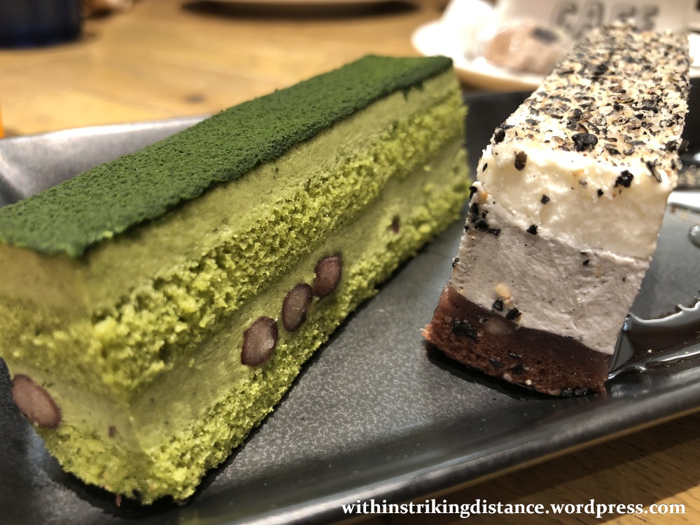 My selection: a pair of Japanese-style cakes, green tea and black sesame flavour (抹茶と黒ごまの和風ケーキ, matcha to kurogoma no wafū kēki, 600 yen), paired with hot coffee (extra 210 yen if ordered as a set with dessert).