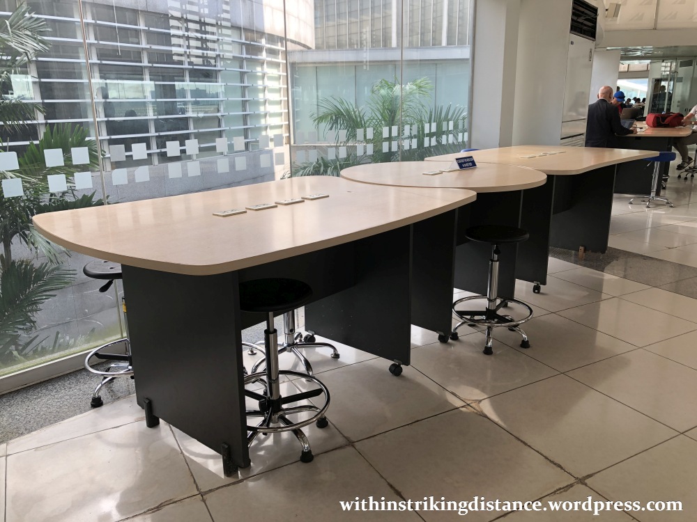 In addition to the tables with built-in power outlets mentioned earlier, I saw at least two charging stations, one at either end of the north wing. These are shamelessly sponsored set-ups paid for by the country’s two largest mobile service providers.