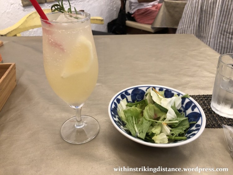 I ordered the restaurant’s classic 王様焼カレー (Ō-sama yaki-karē / 1,080 yen with tax / side salad included) – that’s the dish featured on the upper-right-hand corner of the menu. And to wash it down, a glass of chilled 門司港バナナスカッシュ (Mojikō banana sukasshu / 324 yen with tax if ordered with a main course), a banana-flavoured carbonated beverage.