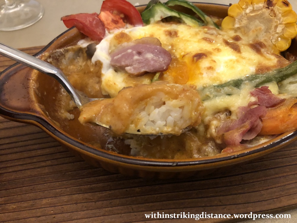 Fresh from the oven, the contents of that rustic ceramic dish were piping hot, and it was a good few minutes before I dared to take my first bite. (Well, the caption on the menu did say アツアツとろとろめしあがれ! so I can’t say I wasn’t forewarned.) It was, as I’d expected, a hodgepodge – but of the best kind. A furious mashing of textures and flavours, all cemented together by the cheesy, eggy mess of the curry sauce.