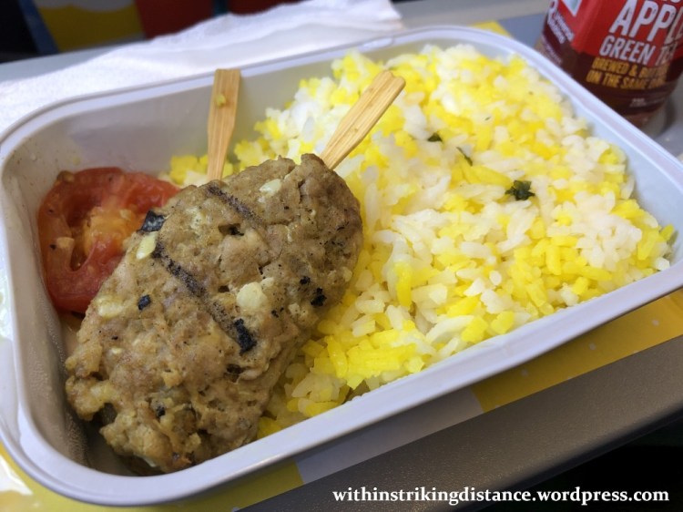My selection from the pre-order menu: chicken kebabs in garlic yogurt sauce, with rice and grilled tomato on the side. Pre-ordered rice meals are served with a complimentary beverage (of the airline’s choice, not the passenger’s) – in this case, a 230 ml bottle of sweet apple-flavoured tea.